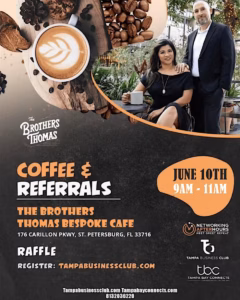 Wake up and network with purpose at Coffee & Referrals, happening Tuesday, June 10 from 9 AM to 11 AM at The Brothers Thomas Bespoke CafΓ©, located at 176 Carillon Parkway, St. Petersburg, FL.