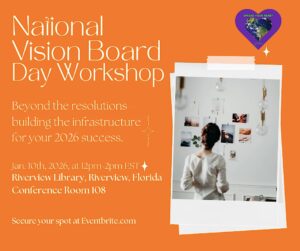 Kick off the new year inspired and intentional at the National Vision Board Day Workshop on January 10 from 12pm to 2pm EST at the Riverview Public Library in Riverview, FL. This creative, interactive event invites you to reflect on your goals, dreams, and aspirations — and bring them to life visually through your own personalized vision board.