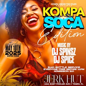 Kompa Under The Stars: Kompa Meets Soca Edition, happening on Saturday, May 10th, from 10:00 PM to 3:00 AM, at 1241 East Fowler Avenue, Tampa, FL 33612.