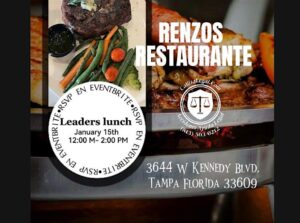 Step away from the office and into meaningful conversation at LEADERS LUNCH, happening on January 15 from 12:00 PM to 2:00 PM EST at Renzo’s, located at 3644 West Kennedy Boulevard, Tampa, FL 33609.