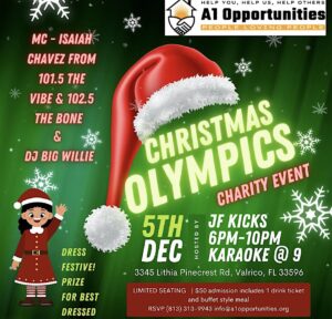 Bring the holiday cheer and your competitive spirit! On December 5, from 6:00 PM to 10:00 PM EST, JF Kicks Restaurant & Patio Bar in Valrico will host the festive A1 Opportunities Christmas Olympics β a night packed with games, fun challenges, and holiday excitement.