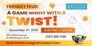 If you think youโve got quick wits, fast reflexes, and a competitive spirit, itโs time to put them to the test! On November 4th from 5:00 PM to 7:30 PM EST, the stunning Imagine Museum in St. Petersburg transforms into a lively game show set for โFriendly Feud: A Game Night with a Twist!โ