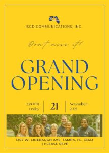 Celebrate a new milestone in Tampa’s business community at the SGD Communications Inc. Grand Opening on November 21, from 3 PM to 5 PM EST at 1207 West Linebaugh Avenue, Tampa, FL 33612.