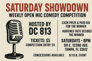 Tampa, are you ready for the ultimate stage battle? The spotlight is calling at the Saturday Showdown Open Mic Competition, happening every Saturday at 8 PM at 911 E 122nd Avenue. Whether you’re a lyrical genius, a soulful singer, a spoken word warrior, or a stand-up comic β this is your moment to shine!