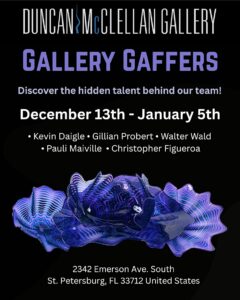 Step into a world of color, creativity, and craftsmanship at the Gallery Gaffers Exhibition on December 13 from 10 AM to 9 PM EST at the Duncan McClellan Gallery, located at 2342 Emerson Avenue South, St. Petersburg, FL 33712.