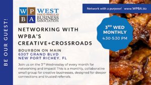 Calling all artists, innovators, and creative thinkers! Creative+Crossroads, WPBAβs monthly collaboration group for creatives, is the ultimate hub for inspiration, networking, and collaboration. Happening every 3rd Wednesday of the month at Bourbon On Main in New Port Richey, this event is designed to spark ideas, foster partnerships, and celebrate the vibrant creative community in West Pasco and beyond.