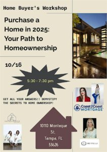 Held at 10110 Montague Street in Tampa, this two-hour interactive session breaks down everything you need to know β from financing and credit readiness to finding the right home and closing with confidence.