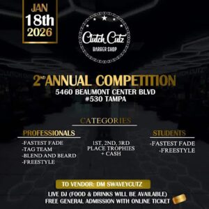 Get ready for a day full of style, skill, and creativity! Join Clutch Cutz Barbershop for their 2nd Annual Competition on January 18 from 12 PMβ6 PM EST at 5460 Beaumont Center Boulevard, #530, Tampa, FL 33634.
