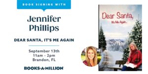 Calling all bookworms, romance fans, and lovers of great storytelling β hereβs your chance to meet one of todayβs rising literary stars! Join us for a special Book Signing with Jennifer Phillips on Saturday, September 13, from 11:00 AM to 2:00 PM EDT at Books-A-Million (839 Brandon Town Center Drive #Mall, Brandon, FL 33511).