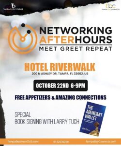 Join Tampaβs brightest minds and most ambitious professionals for an evening of inspiration and connection at the Networking After-Hours & Book Signing, happening Wednesday, October 22 from 6 PM to 9 PM at the elegant Hotel Tampa Riverwalk.
