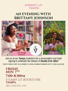Join celebrated author and storyteller Brittany Johnson for an intimate evening of conversation, connection, and community at her Book Signing + Convo on Friday, November 7 from 7:00 β 8:30 PM EST at the cozy and creative Steamy Lit in Tampa, FL.
