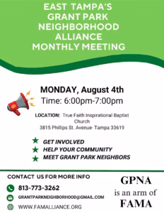 East Tampa residents β your voice matters! Join your neighbors, local leaders, and stakeholders at the Grant Park Community Meeting for an important evening of connection and conversation. This gathering is your opportunity to stay informed on neighborhood updates, share your ideas, and be part of positive change in Grant Park.