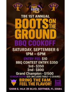 It’s time to turn up the heat and kick off the season with purpose! Don’t miss the TBE Boots on the Ground BBQ Kickoff on Saturday, September 6, from 1:00 PM to 6:00 PM EDT (doors open at 12:30 PM) at 12008 E M.L.K. Jr Blvd, Seffner, FL 33584.