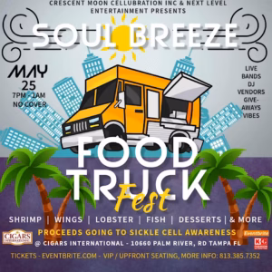 The SOUL BREEZE FOOD TRUCK FESTIVAL rolls into town on Saturday, May 25th at 7:00 PM and keeps the party going until 1:00 AM on Sunday, May 26th at the Cigars International Superstore (10660 Palm River Road, Tampa, FL 33619).