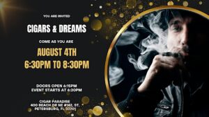Step into a night of sophistication, connection, and vision at Cigars and Dreams β Networking for Professionals, happening Monday, August 4 from 6:30 PM to 8:30 PM at the upscale Cigar Paradise Royal Lounge (400 Beach Drive NE #142, St. Petersburg, FL).