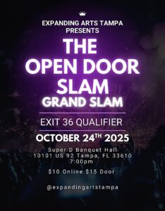 Get ready for an unforgettable night of raw emotion, electric energy, and powerful storytelling at the Open Door Slam: Grand Slam! 🎀 Happening Friday, October 24 from 7–10 PM at Super D Banquet Hall (10101 U.S. 92, Tampa, FL), this event is where Tampa’s most passionate poets and performers go head-to-head in a celebration of words, rhythm, and community.