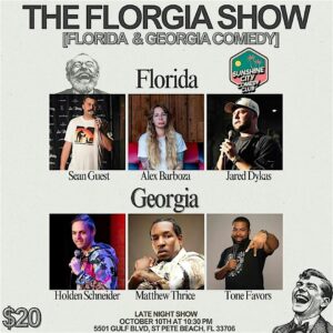 What happens when Florida and Georgia collide? A night of non-stop laughter, thatโ€™s what! Donโ€™t miss The Florgia Show on Friday, October 10, from 10:30โ€“11:45 PM EDT (doors open at 10 PM) at the Sunshine City Comedy Club in beautiful St. Pete Beach.