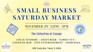 Trinity, FL, get ready for a day of shopping, community, and fun! Join the Small Business Saturday Market on November 29, from 12:00 PM to 5:00 PM (EST) at The Collective at Escape and discover an incredible selection of local businesses, handmade goods, and unique products.