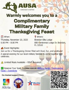This Thanksgiving season, come together for an evening of gratitude, community, and celebration at the Military Family Thanksgiving Feast β happening Thursday, November 20, from 6:00β8:00 PM (EST) at the Brandon Elks Lodge, 800 Centennial Lodge Drive, Brandon, FL 33510.