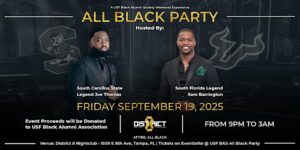 The wait is overβUSF Black Alumni Society Weekend is bringing the heat with the ultimate celebration: the All Black Party | THE NIGHT CAP! Join fellow Bulls, friends, and partygoers on Friday, September 19, starting at 9 PM EDT at the electrifying District 8 Night Club for a night of style, music, and unforgettable memories.