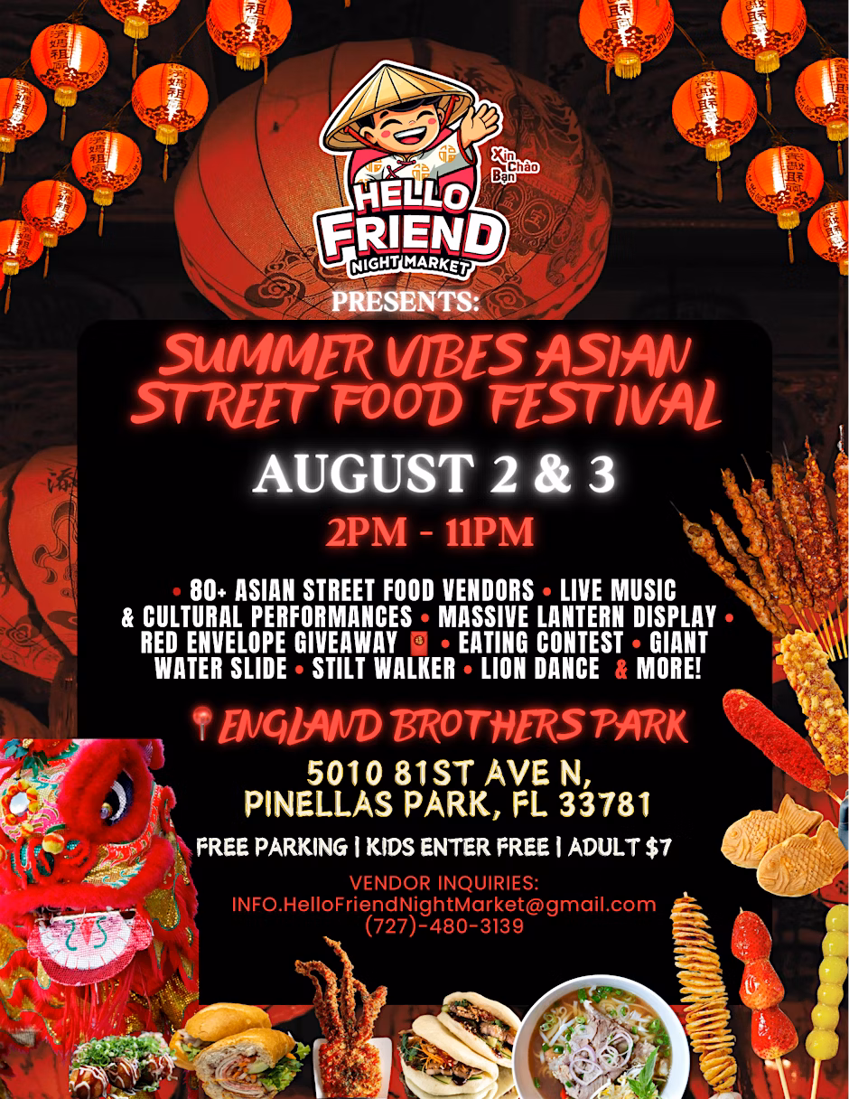 Mark your calendars for Saturday, August 2, from 2 PM to 11 PM, and head to England Brothers Park in Pinellas Park for an unforgettable explosion of flavor, rhythm, and culture. Hosted by Hello Friend Night Market, this vibrant festival brings together the best of Asian street food, live music, local vendors, and community energy in one epic celebration. Whether you’re craving sizzling skewers, bold bubble tea, or a night dancing under the stars, this is the ultimate summer hangout for foodies, families, and festival-lovers alike! π Reserve your spot now: π Get Tickets on Eventbrite https://www.eventbrite.com/e/massive-summer-vibes-asian-street-food-music-festival-tickets-1366483903139?aff=ebdssbdestsearch π Location: England Brothers Park 5010 81st Avenue North Pinellas Park, FL 33781 Follow the fun on Instagram: @hellofriend.nightmarket Event Sneak Peek πΈ Donβt miss out β come hungry, leave happy, and soak up all the summer vibes! #Tampa #TampaBay #StPete #Clearwater #ThingsToDo #LocalEvents #Networking #TampaBayConnects #TampaNetworking #WomenInBusiness #TampaEntrepreneurs #Startups #TampaEats #TampaNightlife #DowntownTampa #TampaEvents #TampaSocials#tampaMagazine #TampaBayMagazine TampaBusinessClub tampabayconnects.com WomenImpactNetwork TampaBayLatinChamber https://www.eventbrite.com/e/massive-summer-vibes-asian-street-food-music-festival-tickets-1366483903139?aff=ebdssbdestsearch tampabayconnects