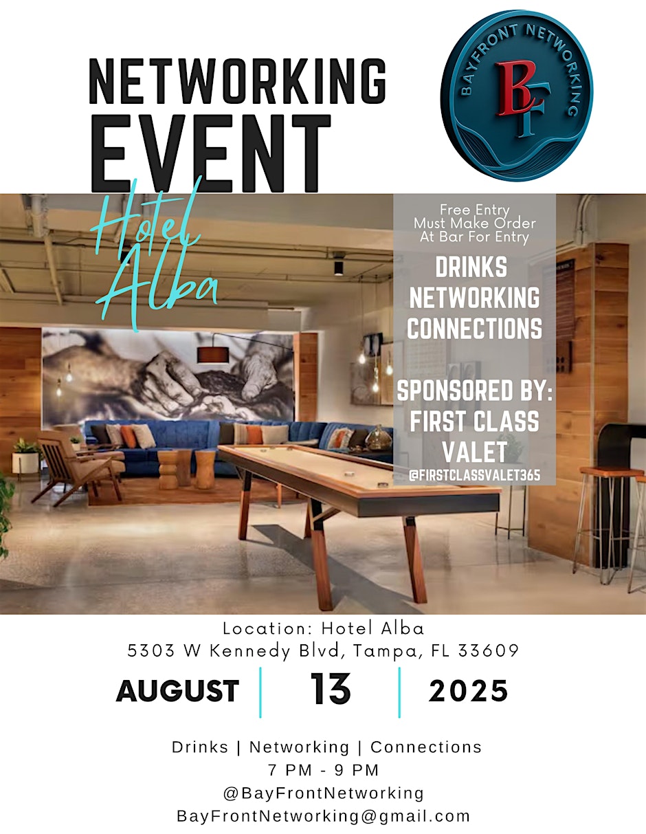 Get ready for a night of stylish networking in one of Tampaβs most stunning venues! Join us for “Networking at Hotel Alba” on Wednesday, August 13, from 7 PM to 9 PM at the chic Hotel Alba Tampa, Tapestry Collection by Hilton, located at 5303 West Kennedy Boulevard. This is more than just another networking mixerβit’s a curated experience for professionals, entrepreneurs, and creatives ready to make meaningful connections. Whether youβre looking to grow your business, collaborate with other visionaries, or simply meet new friends in a vibrant setting, this event delivers the perfect mix of class and connection. ποΈ Spots are limitedβsecure yours today: π Register here β¨ Brought to you by the powerhouse community builders at @bayfrontnetworking and elevated with premium valet service from @firstclassvalet365 Dress to impress, bring your business cards, and prepare to make moves. This is the kind of night that opens doorsβdonβt miss it! #Tampa #TampaBay #StPete #Clearwater #ThingsToDo #LocalEvents #Networking #TampaBayConnects #TampaNetworking #WomenInBusiness #TampaEntrepreneurs #Startups #TampaEats #TampaNightlife #DowntownTampa #TampaEvents #TampaSocials#tampaMagazine #TampaBayMagazine Β TampaBusinessClub.com Tampabayconnects.com WomenImpactNetwork.com TampaBayLatinChamber.com https://www.eventbrite.com/e/networking-at-hotel-alba-tickets-1511238036649?aff=ebdssbdestsearch tampabayconnects