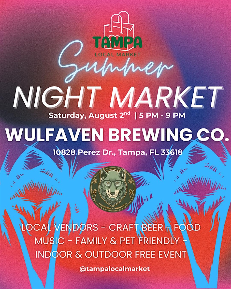 Date: Saturday, August 2 Time: 5:00 PM – 9:00 PM Location: Wulfaven Brewing Company, 10828 Perez Drive, Tampa, FL Local flavor, handmade goods, live music, and craft beer come together for this vibrant summer market night! πΆ Live music π Unique vendors π» Craft beer πΈ Photo ops π RSVP: Register here π² Follow: @tampalocalmarket #Tampa #TampaBay #StPete #Clearwater #ThingsToDo #LocalEvents #Networking #TampaBayConnects #TampaNetworking #WomenInBusiness #TampaEntrepreneurs #Startups #TampaEats #TampaNightlife #DowntownTampa #TampaEvents #TampaSocials#tampaMagazine #TampaBayMagazine Β TampaBusinessClub.com Tampabayconnects.com WomenImpactNetwork.com TampaBayLatinChamber.com https://www.eventbrite.com/e/summer-night-market-tickets-1502022502739?aff=ebdssbdestsearch tampabayconnects