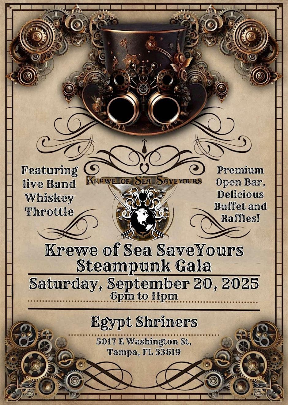 Date: Saturday, September 20 Time: 6:00 PM – 11:00 PM (Doors at 5:40 PM) Location: Egypt Shriners, 5017 East Washington Street, Tampa, FL A fantasy steampunk gala with fashion, dancing, auctions, and purposeβall to support ocean conservation. π Fashion & fantasy πΆ Entertainment π« Auctions & impact π Get Tickets: Register here π² Join discussion: Facebook Group #Tampa #TampaBay #StPete #Clearwater #ThingsToDo #LocalEvents #Networking #TampaBayConnects #TampaNetworking #WomenInBusiness #TampaEntrepreneurs #Startups #TampaEats #TampaNightlife #DowntownTampa #TampaEvents #TampaSocials#tampaMagazine #TampaBayMagazine Β TampaBusinessClub.com Tampabayconnects.com WomenImpactNetwork.com TampaBayLatinChamber.com https://www.eventbrite.com/e/krewe-of-sea-saveyours-steampunk-gala-tickets-1145560274619?aff=ebdssbdestsearch tampabayconnects