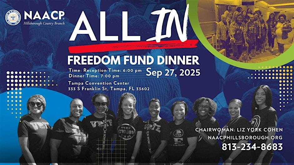 Mark your calendar for one of the most powerful evenings of the year—The NAACP Hillsborough County Freedom Fund Dinner is set for Saturday, September 27th, from 6:00 PM to 9:00 PM at the prestigious Tampa Convention Center. 📍 Location: Tampa Convention Center 333 South Franklin Street, Tampa, FL 33602 🗓️ Date: Saturday, September 27 🕕 Time: 6:00 PM – 9:00 PM EDT This inspiring event brings together civic leaders, changemakers, business professionals, and community members to celebrate progress, resilience, and the ongoing fight for civil rights. Expect an unforgettable evening of impactful keynote speakers, powerful storytelling, and a renewed call to action—all while enjoying an elegant dinner experience in the heart of downtown Tampa. 💬 Why Attend? Support the mission of the NAACP Connect with local leaders and visionaries Celebrate achievements in civil rights and social justice Be part of shaping the future of our community 🎟️ Reserve your seat now: Register here! 📸 Instagram Event Post Dress to impress, come ready to be inspired, and join us for an evening that honors the past while building a brighter future for all. #Tampa #TampaBay #StPete #Clearwater #ThingsToDo #LocalEvents #Networking #TampaBayConnects #TampaNetworking #WomenInBusiness #TampaEntrepreneurs #Startups #TampaEats #TampaNightlife #DowntownTampa #TampaEvents #TampaSocials #tampaMagazine #TampaBayMagazine TampaBusinessClub.com tampabayconnects.com WomenImpactNetwork.com TampaBayLatinChamber.com https://www.eventbrite.com/e/naacp-hillsborough-county-freedom-fund-dinner-tickets-1347260986879?aff=ebdssbdestsearch tampabayconnects