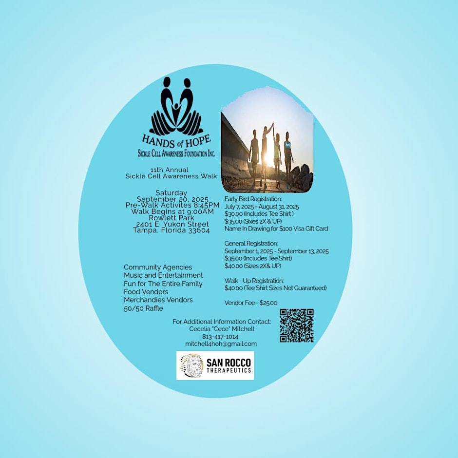 Join the movement to make a difference at the 11th Annual Sickle Cell Awareness Walk, happening on Saturday, September 20th, from 9 AM β 1 PM EDT at Rowlett Park. This inspiring community event brings families, friends, and advocates together to raise awareness and support for those living with sickle cell disease. With every step, youβll be part of a powerful message of hope, resilience, and unity. Expect a morning filled with energy, encouragement, and community spirit β plus opportunities to learn more about sickle cell, connect with others, and support vital initiatives that help improve lives. β¨ Take a stand, take a step β register today and walk for the cause: Click here to register Get tickets on UNATION π² Stay connected for updates & highlights: FacebookΒ Β #Tampa #TampaBay #StPete #Clearwater #ThingsToDo #LocalEvents #Networking #TampaBayConnects #TampaNetworking #WomenInBusiness #TampaEntrepreneurs #Startups #TampaEats #TampaNightlife #DowntownTampa #TampaEvents #TampaSocials #tampaMagazine #TampaBayMagazine TampaBusinessClub.comΒ tampabayconnects.com WomenImpactNetwork.com TampaBayLatinChamber.com https://www.eventbrite.com/e/11th-annual-sickle-cell-awareness-walk-tickets-1542837892669?aff=ebdssbdestsearchΒ tampabayconnects