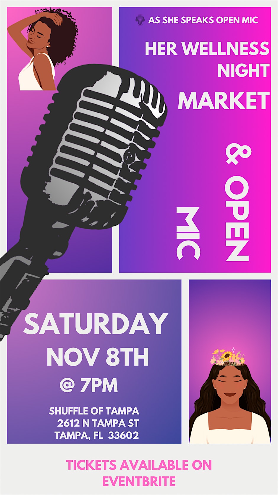 Tampa, get ready for a magical evening where wellness meets creativity! Join us on Saturday, November 8, from 7:00 PM to 9:00 PM EST at Shuffle (2612 North Tampa Street, Tampa, FL 33602) for an unforgettable experience: Her Wellness Market & Open Mic (As She Speaks Open Mic). This event is more than just a market β it’s a soul-nourishing celebration of womenβs voices, self-care, and community. Browse through local wellness vendors, connect with like-minded women, and soak up the empowering energy of live performances from poets, speakers, and storytellers during the open mic portion. Curated by the inspiring team at @as_she_speaks_events, this is a space where healing, self-expression, and sisterhood take center stage. ποΈ Reserve your spot and be part of something powerful! π Register Here Whether youβre sharing your story or just soaking it all in, this night is for you. Come as you are β and leave feeling seen, heard, and inspired. π« #Tampa #TampaBay #StPete #Clearwater #ThingsToDo #LocalEvents #Networking #TampaBayConnects #TampaNetworking #WomenInBusiness #TampaEntrepreneurs #Startups #TampaEats #TampaNightlife #DowntownTampa #TampaEvents #TampaSocials#tampaMagazine #TampaBayMagazine TampaBusinessClub.com Tampabayconnects.com WomenImpactNetwork.com TampaBayLatinChamber.com https://www.eventbrite.com/e/her-wellness-market-open-mic-as-she-speaks-open-mic-tickets-1505265964019?aff=ebdssbdestsearch tampabayconnects
