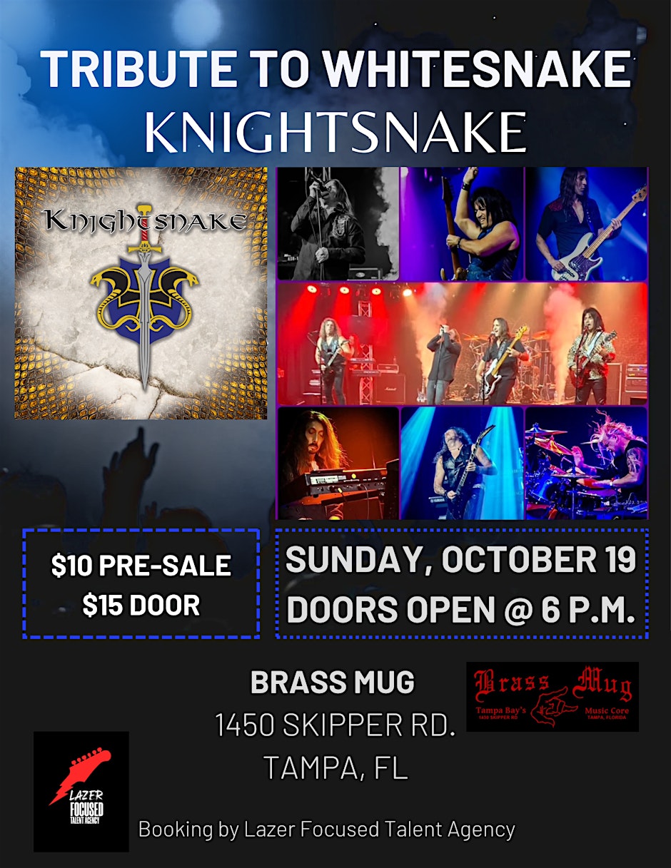Calling all rock fans! On Sunday, October 19, the legendary sounds of Whitesnake will roar through Brass Mug in Tampa as Knightsnake, the ultimate tribute band, hits the stage for one epic night of classic rock anthems. From βHere I Go Againβ to βIs This Loveβ, Knightsnake channels the energy, style, and sound of the iconic British rockers with incredible accuracy and raw power. Whether youβre a die-hard Whitesnake fan or just love an unforgettable live show, this is your chance to experience the music the way it was meant to be heard β loud, electric, and full of soul. π Location: Brass Mug β 1450 Skipper Road, Tampa, FL 33613 π Time: 6:00 PM β 11:00 PM (doors open early, so come ready to rock!) πΈ Follow the vibe: @whitesnakeuk Expect shredding guitar solos, soaring vocals, and an atmosphere thatβll have you headbanging all night. The Brass Mug is an iconic venue for Tampaβs rock scene β and itβs the perfect place to crank up the volume. ποΈ Tickets are going fast β donβt wait! π Grab yours now on Eventbrite #Tampa #TampaBay #StPete #Clearwater #ThingsToDo #LocalEvents #Networking #TampaBayConnects #TampaNetworking #WomenInBusiness #TampaEntrepreneurs #Startups #TampaEats #TampaNightlife #DowntownTampa #TampaEvents #TampaSocials#tampaMagazine #TampaBayMagazine TampaBusinessClub.com Tampabayconnects.com WomenImpactNetwork.com TampaBayLatinChamber.com https://www.eventbrite.com/e/tribute-to-whitesnake-knightsnake-tickets-1553587184089?aff=ebdssbdestsearch tampabayconnects