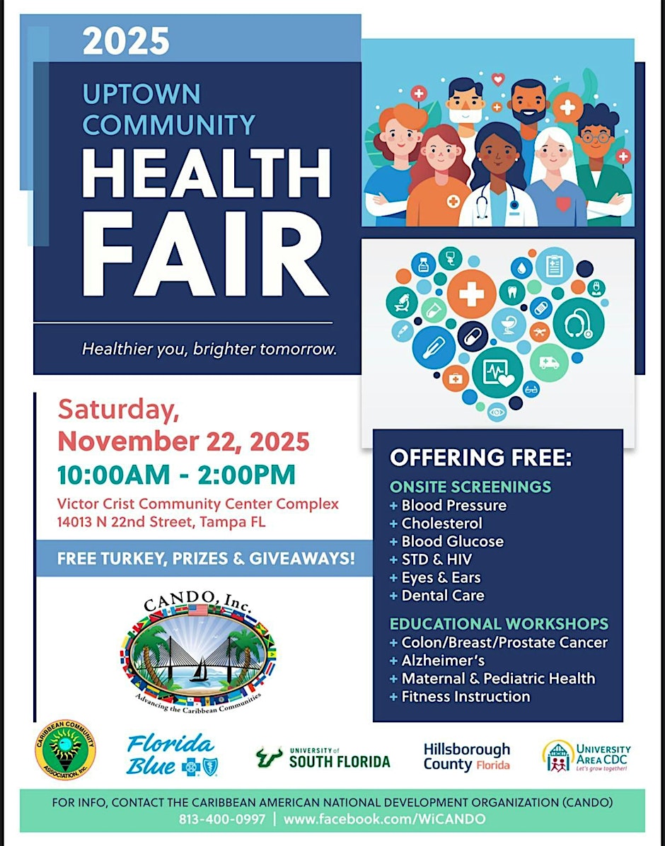 Tampa, itβs time to focus on you β your health, happiness, and community! Β Join us on Saturday, November 22, from 10:00 a.m. to 2:00 p.m. EST at the Victor Crist Community Center Complex (14013 North 22nd Street, Tampa, FL) for the Uptown Community Health Fair β a free, family-friendly celebration of wellness and togetherness. Discover a day filled with health screenings, fitness demos, wellness resources, and insights from local health professionals dedicated to helping you live your best life. Whether youβre starting your health journey or deepening it, this event is designed to inspire, educate, and connect people of all ages. ποΈ Reserve your spot today: Register on Eventbrite π Learn more: wicando.org πΈ Stay connected: @candotampa on Instagram ποΈ Reserve your spot today: π Register on Eventbrite #Tampa #TampaBay #StPete #Clearwater #ThingsToDo #LocalEvents #Networking #TampaBayConnects #TampaNetworking #WomenInBusiness #TampaEntrepreneurs #Startups #TampaEats #TampaNightlife #DowntownTampa #TampaEvents #TampaSocials#tampaMagazine #TampaBayMagazine TampaBusinessClub.com Tampabayconnects.com WomenImpactNetwork.com TampaBayLatinChamber.com https://www.eventbrite.com/e/uptown-community-health-fair-tickets-1708035402869?aff=ebdssbdestsearch tampabayconnects