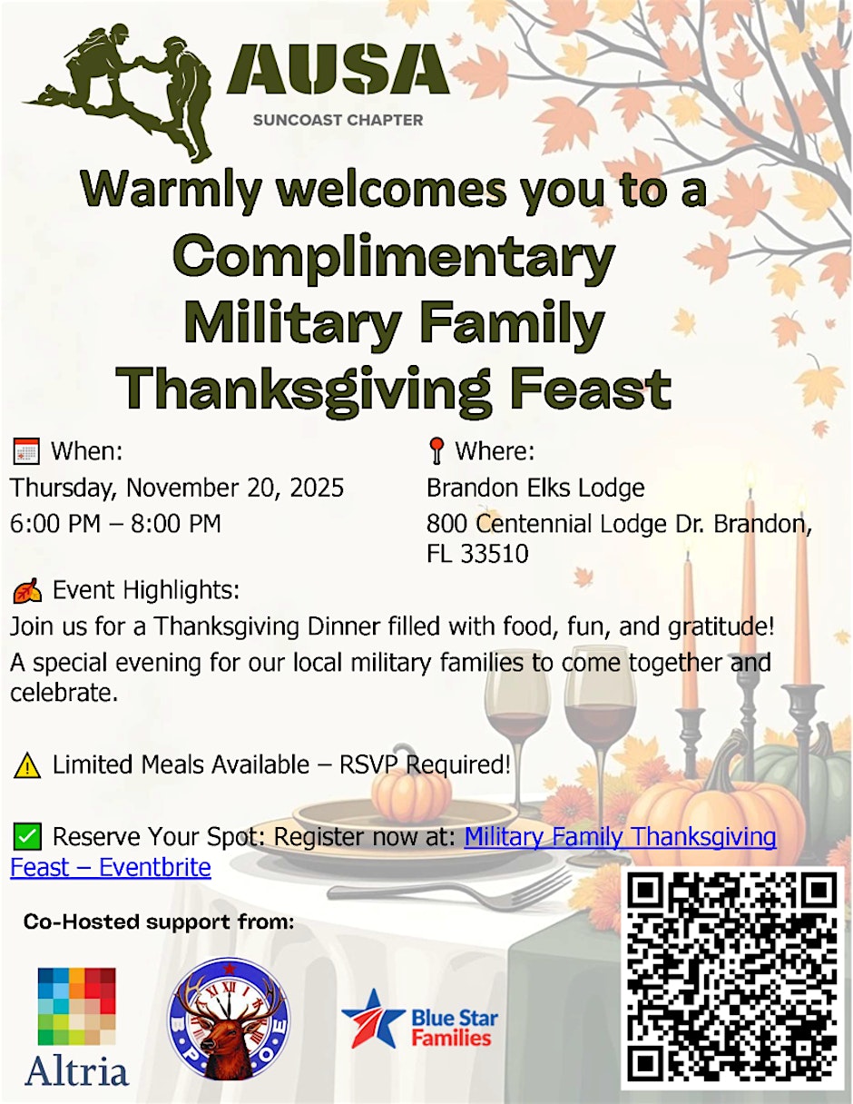 This Thanksgiving season, come together for an evening of gratitude, community, and celebration at the Military Family Thanksgiving Feast β happening Thursday, November 20, from 6:00β8:00 PM (EST) at the Brandon Elks Lodge, 800 Centennial Lodge Drive, Brandon, FL 33510. Hosted with heartfelt appreciation, this annual feast honors the brave men and women who serve β and the families who stand beside them. Guests will enjoy a complimentary, home-style Thanksgiving dinner complete with all the traditional favorites, surrounded by warmth, laughter, and the spirit of giving thanks. Itβs more than a meal β itβs a moment to connect with fellow military families, share stories, and feel the support of a community thatβs proud to stand with those who sacrifice so much. ποΈ Whether youβre active duty, a veteran, or a proud military family member, youβre invited to join this special evening dedicated to you. ποΈ Reserve your spot today! Seating is limited β click here to register and join us in celebrating service, family, and gratitude. πΈ Stay connected with the Brandon Elks Lodge and see more community events on Instagram: @brandonelkslodge2383 Because this Thanksgiving, weβre serving those whoβve served us. π¦π #Tampa #TampaBay #StPete #Clearwater #ThingsToDo #LocalEvents #Networking #TampaBayConnects #TampaNetworking #WomenInBusiness #TampaEntrepreneurs #Startups #TampaEats #TampaNightlife #DowntownTampa #TampaEvents #TampaSocials#tampaMagazine #TampaBayMagazine TampaBusinessClub.com Tampabayconnects.com WomenImpactNetwork.com TampaBayLatinChamber.com https://www.eventbrite.com/e/military-family-thanksgiving-feast-tickets-1037211546657?aff=ebdssbdestsearch tampabayconnects