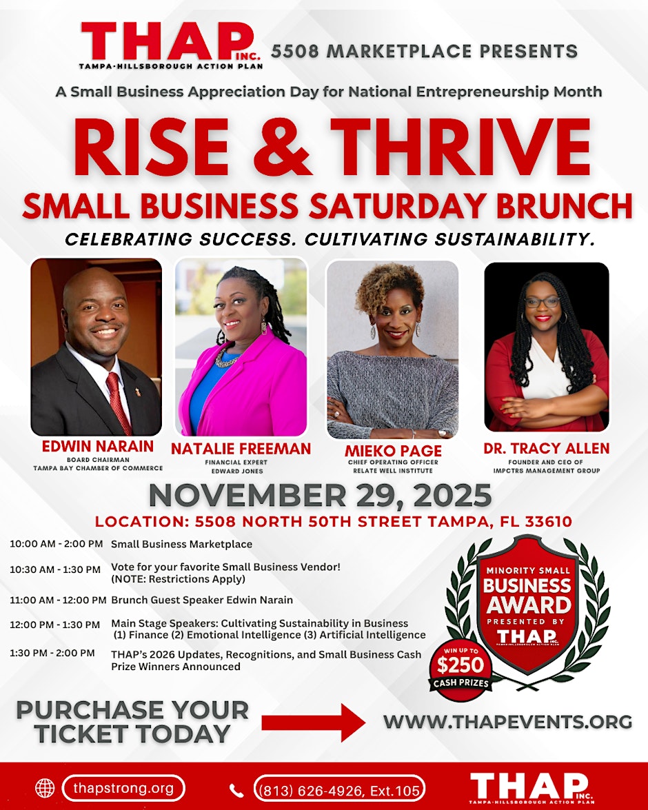 Get ready to raise your glass and your business! On Saturday, November 29, from 10:00β―AM to 2:00β―PM EST, TampaβHillsborough Action Plan, Inc. is hosting the Rise & Thrive Small Business Saturday Brunch at 5508 Northβ―50th Street, Suite 7, Tampa, FLβ―33610. This isnβt just brunch β itβs a celebration of entrepreneurship, community, and sustainability. Expect a lineup of inspiring speakers, including Edwin Narain (Tampa Bay Chamber of Commerce), Natalie Freeman (Edward Jones), Mieko Paige (RelateWell Institute), and Dr. Tracy Allen (Impacts Management Group). πVenue: 5508 Northβ―50th Street, Suite 7, Tampa, FLβ―33610 Whatβs more: you’ll enjoy a vibrant marketplace, delicious food, and chances to win vendor prizes β especially for minority-owned businesses, who can compete for up to $250 in cash awards. πΉClaim your free ticket today: Click here π§¨Donβt miss this chance to connect, celebrate, and elevate your small business β all while enjoying a meaningful brunch with Tampaβs entrepreneurial community. See you there! #Tampa #TampaBay #StPete #Clearwater #ThingsToDo #LocalEvents #Networking #TampaBayConnects #TampaNetworking #WomenInBusiness #TampaEntrepreneurs #Startups #TampaEats #TampaNightlife #DowntownTampa #TampaEvents #TampaSocials#tampaMagazine #TampaBayMagazine TampaBusinessClub.com Tampabayconnects.com WomenImpactNetwork.com TampaBayLatinChamber.com https://www.eventbrite.com/e/rise-thrive-small-business-saturday-brunch-tickets-1940059884339?aff=ebdssbdestsearch tampabayconnects