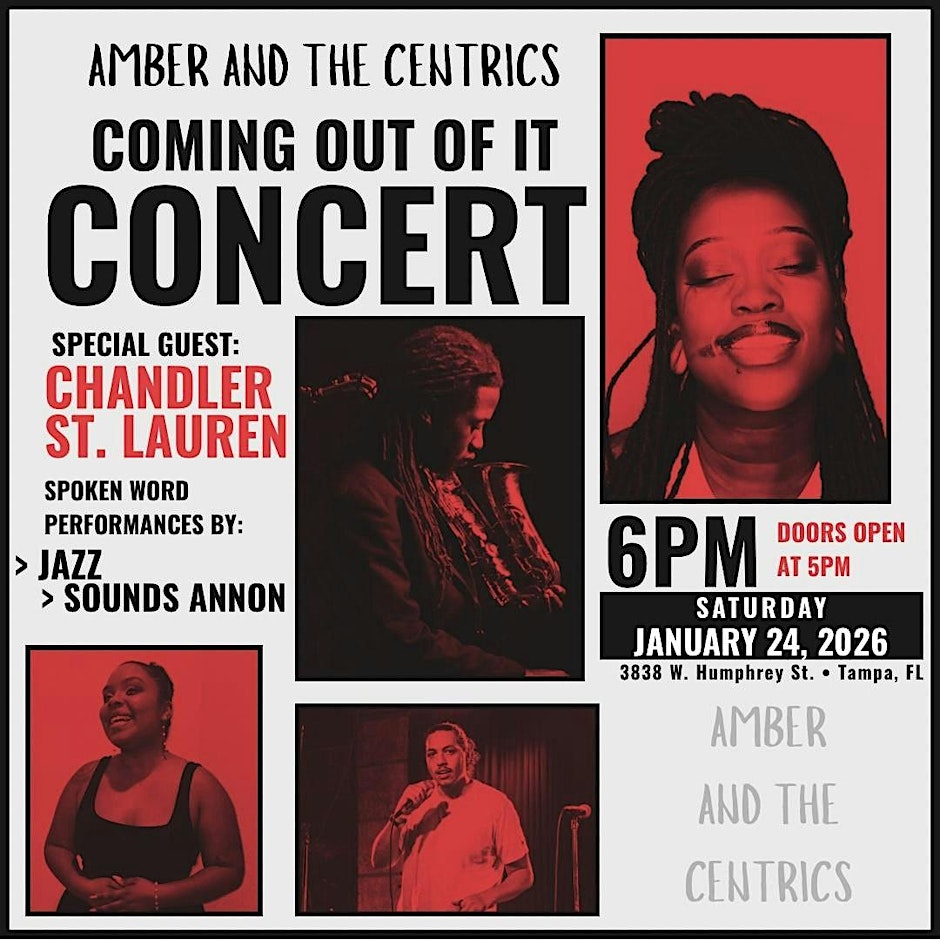 Get ready for a night of live music, powerful performances, and unforgettable vibes in Tampa! On January 24 from 6:00 PM to 9:00 PM EST, music lovers and community fans will gather at The Rock of Tampa Bay for the Coming Out Of It Concert β a celebration of sound, creativity, and connection.Β Featuring Amber and the Centrics performing their new album βComing Out Of Itβ live, plus special guest performances by Chandler St. Lauren and slam poetry and jazz moments, this concert promises to deliver an evening packed with passion and artistry. Doors open at 5:00 PM with a red carpet entrance, photos, food available for purchase, and a lively music experience thatβs perfect for all ages and tastes.Β β¨ Ready to experience the music live? π Register here Come for the performances β stay for the community and the beat that brings it all to life. See you there! π΅#TampaΒ #Tampa #TampaBay #StPete #Clearwater #ThingsToDo #LocalEvents #Networking #TampaBayConnects #TampaNetworking #WomenInBusiness #TampaEntrepreneurs #Startups #TampaEats #TampaNightlife #DowntownTampa #TampaEvents #TampaSocials #tampaMagazine #TampaBayMagazine TampaBusinessClub.com Tampabayconnects.com WomenImpactNetwork.com TampaBayLatinChamber.com https://www.eventbrite.com/e/coming-out-of-it-concert-tickets-1974526942237?aff=ebdssbdestsearch tampabayconnects