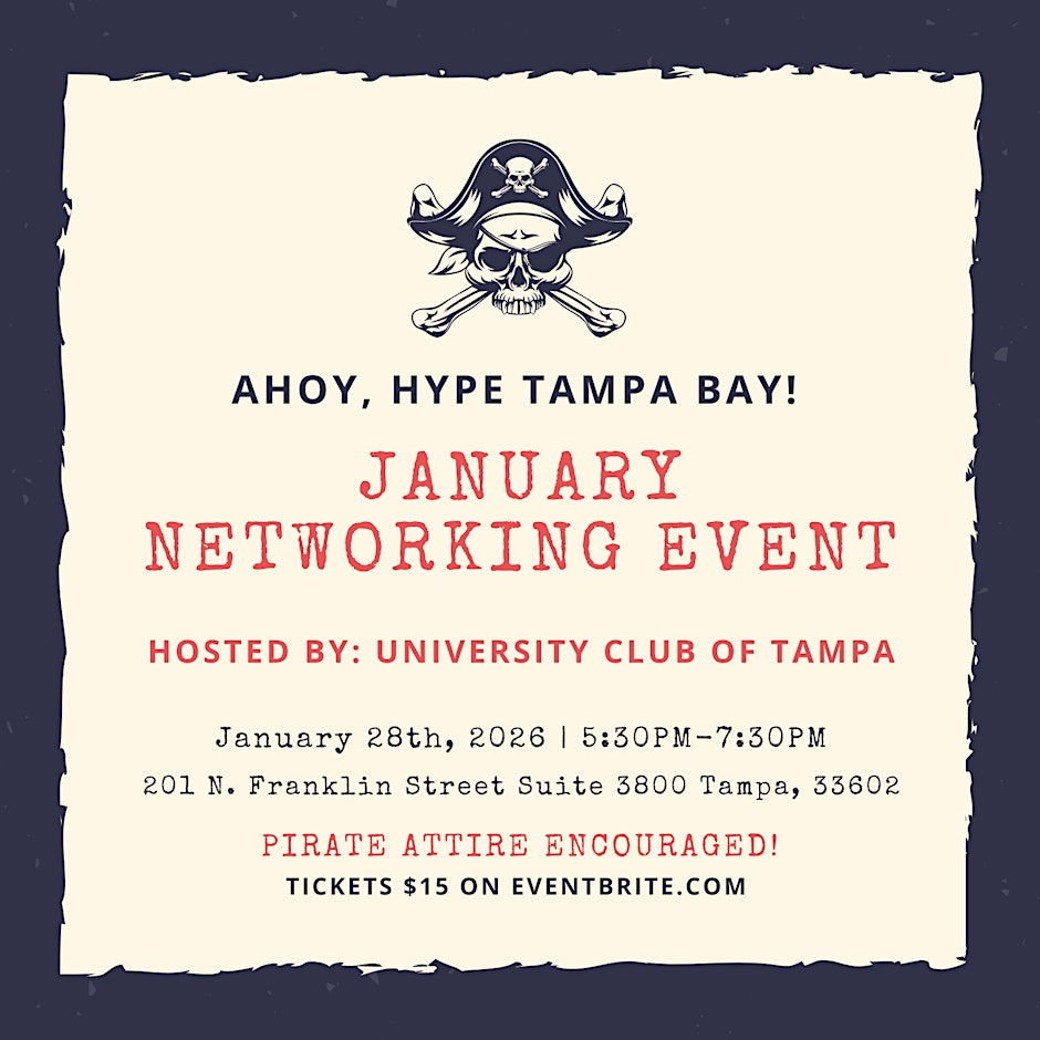 Kick off the New Year with connections, collaboration, and career-boosting opportunities at the January HYPE Tampa Bay Networking Event! Designed for professionals, entrepreneurs, and go-getters, this event provides the perfect space to meet like-minded individuals, share ideas, and grow your network in a dynamic, welcoming environment. Join fellow professionals on January 28 from 5:30 PM to 7:30 PM EST at University Club of Tampa, located at 201 North Franklin Street, #3800, Tampa, FL 33602 β a premier venue ideal for meaningful conversations, business connections, and building lasting relationships. β¨ Ready to elevate your network and make valuable connections? πRegister hereΒ πΈ Follow the event and stay inspired: @hypetampabay Come for the networking, stay for the energy β and make it an evening of opportunities to remember! ππ€β¨ #Tampa #TampaBay #StPete #Clearwater #ThingsToDo #LocalEvents #Networking #TampaBayConnects #TampaNetworking #WomenInBusiness #TampaEntrepreneurs #Startups #TampaEats #TampaNightlife #DowntownTampa #TampaEvents #TampaSocials #tampaMagazine #TampaBayMagazine TampaBusinessClub.com Tampabayconnects.com WomenImpactNetwork.com TampaBayLatinChamber.com https://www.eventbrite.com/e/january-hype-tampa-bay-networking-event-tickets-1978612499248?aff=ebdssbdestsearch tampabayconnects
