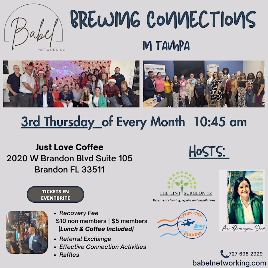 TAMPA, FL – Ready to spark new relationships over a great cup of coffee? Join Tampa’s thriving community of professionals, entrepreneurs, and visionaries at “Brewing Connections in Tampa”, happening Thursday, July 17 from 11:00 AM to 1:00 PM EDT at Just Love Coffee (2020 West Brandon Boulevard, Suite 105, Brandon, FL). This mid-morning meetup is designed to fuel your business and personal growth—one meaningful connection at a time. Whether you’re new to the scene or a networking pro, this laid-back yet purposeful event offers the perfect space to meet collaborators, share ideas, and grow your influence in the local business landscape. Why you should attend: Connect with a diverse group of professionals Share your business, your goals, and your story Discover opportunities for partnerships and growth Enjoy handcrafted coffee in a welcoming atmosphere No pressure. Just people, passion, and possibility. 🎟️ Reserve your seat now and let the conversations begin: 👉 Register here Let’s turn coffee into connection—and conversation into collaboration. See you there! 📲 Follow us on Instagram: @BabelNetworking #Tampa #TampaBay #StPete #Clearwater #ThingsToDo #LocalEvents #Networking #TampaBayConnects #TampaNetworking #WomenInBusiness #TampaEntrepreneurs #Startups #TampaEats #TampaNightlife #DowntownTampa #TampaEvents #TampaSocials#tampaMagazine #TampaBayMagazine TampaBusinessClub.com Tampabayconnects.com WomenImpactNetwork.com TampaBayLatinChamber.com https://www.eventbrite.com/e/brewing-connections-in-tampa-tickets-1141211647759?aff=ebdssbdestsearch tampabayconnects
