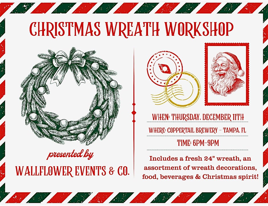 Thereโs holiday magic, and then thereโs the joy of creating something beautiful with your own hands. This December, step into a cozy, creative atmosphere as Wallflower Events & Co. brings you a festive Christmas Wreath Workshop at the iconic Coppertail Brewing Co. Whether youโre crafty or simply curious, this experience promises warmth, laughter, and a holiday creation youโll be proud to show off. ๐ Why Youโll Love This Workshop: ๐ Create your own handcrafted holiday wreath with high-quality materials ๐ป Enjoy Coppertailโs signature brews while you craft ๐ Learn from professional holiday designers โจ Take home a masterpiece youโll be proud to display ๐ค Connect with a fun, festive community ๐ธ Perfect photo moments for holiday content ๐ Date & Time: Dec 11 โข 6pmโ9pm EST ๐ Location: Coppertail Brewing Co; 2601 East 2nd Avenue, Tampa, FL 33605 Surrounded by fellow makers and guided by expert designers, youโll craft a custom wreath using premium seasonal greenery, ribbons, accents, and textures. With craft beer flowing and holiday vibes filling the room, this workshop blends creativity with funโmaking it the perfect December night out. ๐ธ More events. More deals. More energy. Follow us! ๐ Get in early. Register now! This event isnโt just an activity; itโs a memory in the making. Bring a friend, bring a date, or come solo and meet new people who love the holidays just as much as you do. #Tampa #TampaBay #StPete #Clearwater #ThingsToDo #LocalEvents #Networking #TampaBayConnects #TampaNetworking #WomenInBusiness #TampaEntrepreneurs #Startups #TampaEats #TampaNightlife #DowntownTampa #TampaEvents #TampaSocials #tampaMagazine #TampaBayMagazine TampaBusinessClub.com Tampabayconnects.com WomenImpactNetwork.com TampaBayLatinChamber.com https://www.eventbrite.com/e/christmas-wreath-workshop-with-wallflower-events-co-tickets-1962498367446?aff=ebdssbdestsearch tampabayconnects