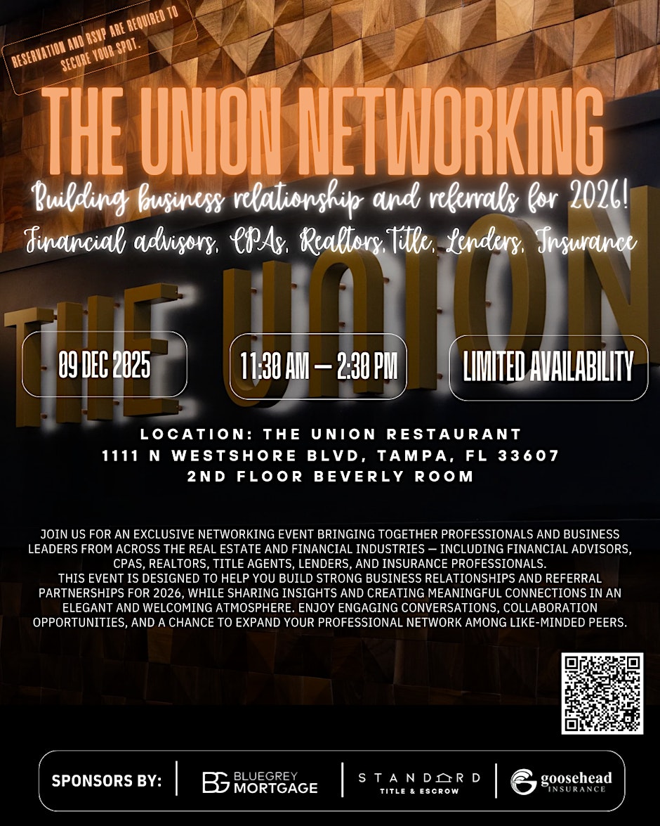 Build meaningful professional relationships at The Union Networking Luncheon, where Tampa’s top business leaders meet to collaborate, share ideas, and spark new ventures. This midday event blends sophistication with approachability—perfect for entrepreneurs, executives, and professionals looking to level up. 📍 1111 North Westshore Blvd, Tampa, FL Enjoy good food, great conversations, and the chance to step into a network that moves business forward. Register here: theunionnetworking 🤝 Grow your network with quality business professionals 💬 Engaging conversations that inspire partnerships 🍽️ Luncheon-style networking in a welcoming environment 💼 Ideal for real estate pros, entrepreneurs, lenders & service providers 🌟 Perfect mid-day reset for productivity & business development 📅 Dec 9 • 11:30 AM – 2:30 PM EST Message us on instagram #Tampa #TampaBay #StPete #Clearwater #ThingsToDo #LocalEvents #Networking #TampaBayConnects #TampaNetworking #WomenInBusiness #TampaEntrepreneurs #Startups #TampaEats #TampaNightlife #DowntownTampa #TampaEvents #TampaSocials#tampaMagazine #TampaBayMagazine TampaBusinessClub.com Tampabayconnects.com WomenImpactNetwork.com TampaBayLatinChamber.com https://www.eventbrite.com/e/the-union-networking-tickets-1967636334243 tampabayconnects