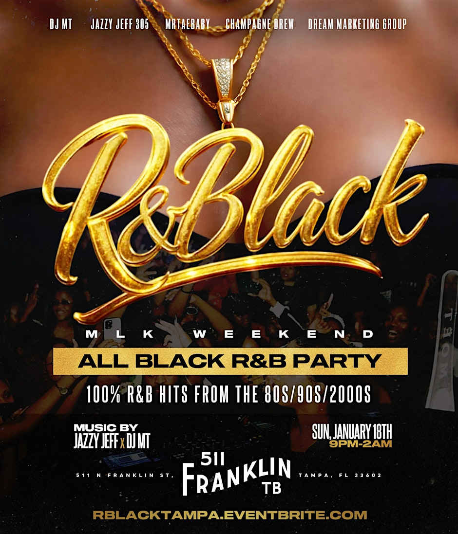 Celebrate Martin Luther King Jr. weekend with a night of 100% R&B from the 80s, 90s, and 2000s at R&BLACK, hosted by Jazzy Jeff and Kreative Marketing Group LLC. Groove to the beats of DJ MT and Jazzy Jeff while enjoying drink and bottle specials all night. Dress in all black if you like, though itโs not required! ๐ Date & Time: Sunday, January 18, 9:00 PM โ Monday, January 19, 2:00 AM EST๐ Location: 511 N Franklin St, Tampa, FL 33602๐ Entry: 21+ only. All sales are final; no refunds.๐ Contact Host for VIP & Info: 305-527-3653 Register / Learn More Tampa Bay Connects is a reshare platform. We do not host these events. We only share them for community engagement purposes #Tampa #TampaBay #StPete #Clearwater #ThingsToDo #LocalEvents #Networking #TampaBayConnects #TampaNetworking #WomenInBusiness #TampaEntrepreneurs #Startups #TampaEats #TampaNightlife #DowntownTampa #TampaEvents #TampaSocials #tampaMagazine #TampaBayMagazine TampaBusinessClub.com Tampabayconnects.com WomenImpactNetwork.com TampaBayLatinChamber.com InGateConsulting.com https://www.eventbrite.com/e/rblack-all-black-mlk-weekend-rb-party-tickets-1980110264103?aff=ebdssbdestsearch Tampa Bay Connectsย is a community discovery and media platform. We do not organize, host, manage, or operate the events featured on this site. All events, trademarks, logos, photographs, and promotional materials are the property of their respective owners and are displayed for informational and promotional purposes only. Our content is shared to help connect the community with local experiences and is sourced from public event listings, organizers, or official promotional channels. Full credit is given to the original event organizers, and direct links to official event pages are provided whenever available. Inclusion onย TampaBayConnects.comย does not imply sponsorship, partnership, or endorsement by Tampa Bay Connects, unless explicitly stated. tampabayconnects