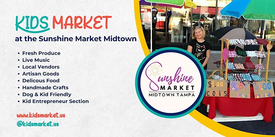 The Kids Market at the Sunshine Market is a recurring event held in Midtown Tampa. This family-friendly market offers a fun and engaging environment where children can shop, sell, and explore a variety of kid-focused goods and activities. Location: Midtown Tampa Date & Time: Multiple dates (check the event registration link for upcoming schedules) Organizer: Kids Market Event registration link: https://www.eventbrite.com/e/kids-market-at-the-sunshine-market-tickets-1366027257299?aff=ebdssbdestsearch For updates and additional information, follow the organizers on social media: Facebook: https://www.facebook.com/kidsmarket.us/ Website: http://www.kidsmarket.us/ Instagram (Post): https://www.instagram.com/p/DOynTiHjsFY/ Instagram (Reel): https://www.instagram.com/reel/DSqUXi4DrJ4/ Facebook Event Page: https://www.facebook.com/events/733199686064892/738359028882291/?ref_source=NEWS_FEED #Tampa #TampaBay #StPete #Clearwater #ThingsToDo #LocalEvents #Networking #TampaBayConnects #TampaNetworking #WomenInBusiness #TampaEntrepreneurs #Startups #TampaEats #TampaNightlife #DowntownTampa #TampaEvents #TampaSocials #tampaMagazine #TampaBayMagazine TampaBusinessClub.com Tampabayconnects.com WomenImpactNetwork.com TampaBayLatinChamber.com InGateConsulting.com Event registration link: https://www.eventbrite.com/e/kids-market-at-the-sunshine-market-tickets-1366027257299?aff=ebdssbdestsearch Tampa Bay Connects is a community discovery and media platform. We do not organize, host, manage, or operate the events featured on this site. All events, trademarks, logos, photographs, and promotional materials are the property of their respective owners and are displayed for informational and promotional purposes only. Our content is shared to help connect the community with local experiences and is sourced from public event listings, organizers, or official promotional channels. Full credit is given to the original event organizers, and direct links to official event pages are provided whenever available. Inclusion on TampaBayConnects.com does not imply sponsorship, partnership, or endorsement by Tampa Bay Connects, unless explicitly stated. tampabayconnects