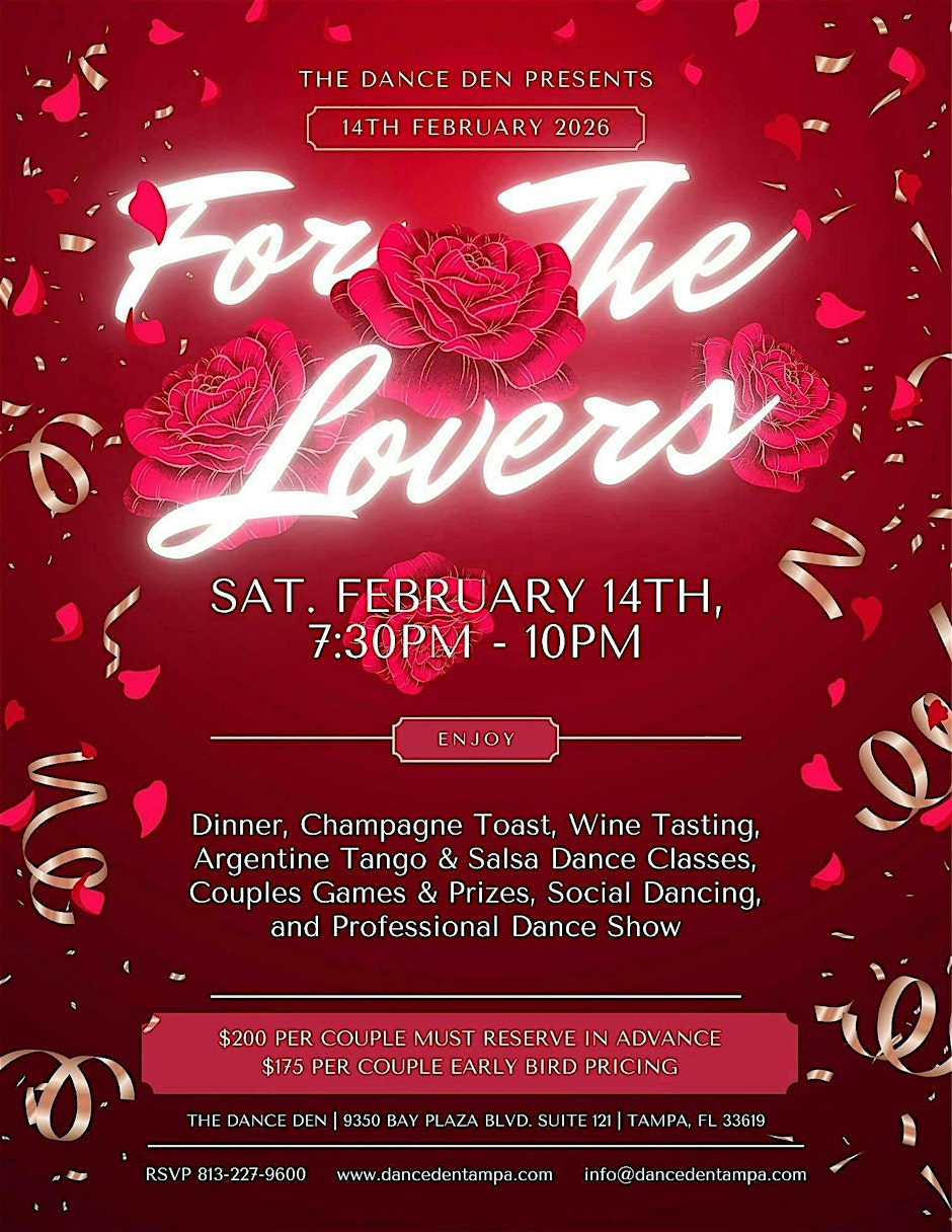 Looking for a fun way to celebrate Valentine’s Day? For The Lovers 2026 is a special dance event hosted at The Dance Den Tampa — perfect for couples, friends, or anyone who loves to dance and celebrate love in style. 📍 Event Details: Organizer: The Dance Den Tampa Location: The Dance Den Tampa, 9350 Bay Plaza Blvd, Suite 121, Tampa, FL 33619, United States Date & Time: February 14 from 7:30 PM to 10:00 PM EST 🎟️ Event Registration: 👉 Get tickets here: https://www.eventbrite.com/e/for-the-lovers-2026-tickets-1979482693021?aff=ebdssbdestsearch 📱 Social Media: Facebook: https://www.facebook.com/groups/2490202394369404/posts/25885722577724056/ Instagram: https://www.instagram.com/p/C12jIFKvo3Y/ #Tampa #TampaBay #StPete #Clearwater #ThingsToDo #LocalEvents #Networking #TampaBayConnects #TampaNetworking #WomenInBusiness #TampaEntrepreneurs #Startups #TampaEats #TampaNightlife #DowntownTampa #TampaEvents #TampaSocials #tampaMagazine #TampaBayMagazine TampaBusinessClub.com Tampabayconnects.com WomenImpactNetwork.com TampaBayLatinChamber.com InGateConsulting.com 🎟️ Event Registration: 👉 Get tickets here: https://www.eventbrite.com/e/for-the-lovers-2026-tickets-1979482693021?aff=ebdssbdestsearch Tampa Bay Connects is a community discovery and media platform. We do not organize, host, manage, or operate the events featured on this site. All events, trademarks, logos, photographs, and promotional materials are the property of their respective owners and are displayed for informational and promotional purposes only. Our content is shared to help connect the community with local experiences and is sourced from public event listings, organizers, or official promotional channels. Full credit is given to the original event organizers, and direct links to official event pages are provided whenever available. Inclusion on TampaBayConnects.com does not imply sponsorship, partnership, or endorsement by Tampa Bay Connects, unless explicitly stated. tampabayconnects