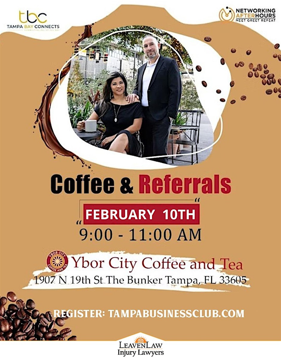 Start your morning connecting with local professionals at Coffee and Referrals @ Ybor City Coffee, an open networking event hosted by Tampa Business Club. This casual meetup is perfect for entrepreneurs, small business owners, and professionals looking to build relationships, share referrals, and grow their network over a cup of coffee. 📍 Event Details: Organizer: Tampa Business Club Location: Ybor City Coffee and Tea Co, Tampa, FL Date & Time: February 10 from 9:00 AM to 11:00 AM EST 🎟️ Event Registration: 👉 RSVP here: https://www.eventbrite.com/e/coffee-and-referrals-ybor-city-coffee-open-networking-tickets-1981444399538?aff=ebdsoporgprofile 📱 Social Media & More Info: Website: https://tampabusinessclub.com/ Instagram: https://www.instagram.com/tampabusinessclub/?hl=en Facebook: https://www.facebook.com/tampabusinessclub/ #Tampa #TampaBay #StPete #Clearwater #ThingsToDo #LocalEvents #Networking #TampaBayConnects #TampaNetworking #WomenInBusiness #TampaEntrepreneurs #Startups #TampaEats #TampaNightlife #DowntownTampa #TampaEvents #TampaSocials #tampaMagazine #TampaBayMagazine TampaBusinessClub.com Tampabayconnects.com WomenImpactNetwork.com TampaBayLatinChamber.com InGateConsulting.com 🎟️ Event Registration: 👉 RSVP here: https://www.eventbrite.com/e/coffee-and-referrals-ybor-city-coffee-open-networking-tickets-1981444399538?aff=ebdsoporgprofile Tampa Bay Connects is a community discovery and media platform. We do not organize, host, manage, or operate the events featured on this site. All events, trademarks, logos, photographs, and promotional materials are the property of their respective owners and are displayed for informational and promotional purposes only. Our content is shared to help connect the community with local experiences and is sourced from public event listings, organizers, or official promotional channels. Full credit is given to the original event organizers, and direct links to official event pages are provided whenever available. Inclusion on TampaBayConnects.com does not imply sponsorship, partnership, or endorsement by Tampa Bay Connects, unless explicitly stated. tampabayconnects