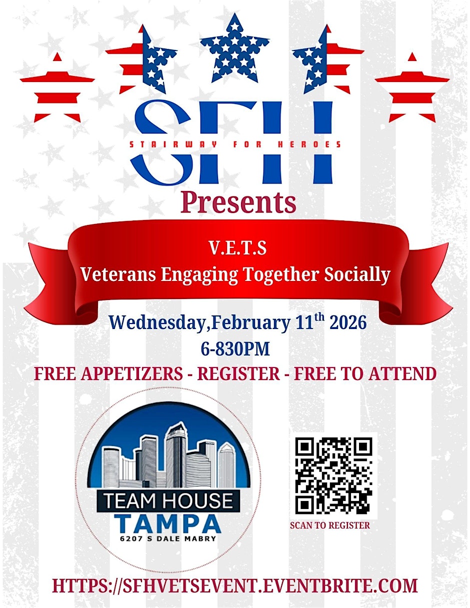 Veterans Engaging Together Socially (V.E.T.S) is a community gathering organized by Stairway For Heroes, created to provide veterans with a relaxed space to connect, socialize, and build supportive relationships. The event will be held at Team House on February 11, from 6:00 PM to 8:30 PM EST. This event is open to veterans looking to engage with others who share similar experiences in a welcoming and respectful environment. Event Details Event: Veterans Engaging Together Socially (V.E.T.S) Organizer: Stairway For Heroes Location: Team House Date: February 11 Time: 6:00 PM – 8:30 PM (EST) Registration Register directly through Eventbrite: https://www.eventbrite.com/e/veterans-engaging-together-socially-vets-tickets-1981393533396?aff=ebdssbdestsearch Organizer on Social Media Instagram: https://www.instagram.com/stairway_for_heroes/?hl=en Facebook: https://www.facebook.com/stairwayforheroes/ #Tampa #TampaBay #StPete #Clearwater #ThingsToDo #LocalEvents #Networking #TampaBayConnects #TampaNetworking #WomenInBusiness #TampaEntrepreneurs #Startups #TampaEats #TampaNightlife #DowntownTampa #TampaEvents #TampaSocials #tampaMagazine #TampaBayMagazine TampaBusinessClub.com Tampabayconnects.com WomenImpactNetwork.com TampaBayLatinChamber.com InGateConsulting.com Register directly through Eventbrite: https://www.eventbrite.com/e/veterans-engaging-together-socially-vets-tickets-1981393533396?aff=ebdssbdestsearch Tampa Bay Connects is a community discovery and media platform. We do not organize, host, manage, or operate the events featured on this site. All events, trademarks, logos, photographs, and promotional materials are the property of their respective owners and are displayed for informational and promotional purposes only. Our content is shared to help connect the community with local experiences and is sourced from public event listings, organizers, or official promotional channels. Full credit is given to the original event organizers, and direct links to official event pages are provided whenever available. Inclusion on TampaBayConnects.com does not imply sponsorship, partnership, or endorsement by Tampa Bay Connects, unless explicitly stated. tampabayconnects