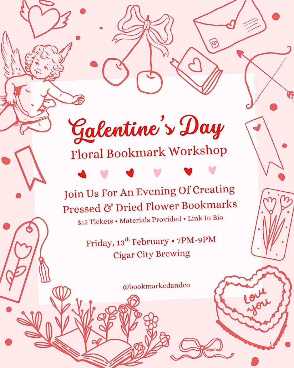 Celebrate friendship and creativity at the Galentine’s Day – Floral Bookmark Workshop, organized by Cigar City Brewing Spruce Street Brewery & Taproom, taking place on Thursday, February 13, from 7:00 PM to 9:00 PM (EST). Hosted at Cigar City Brewing Spruce Street Brewery & Taproom, this hands-on workshop invites participants to design their own floral bookmarks while enjoying a relaxed and social atmosphere—perfect for a fun night out with friends. 📍 Location: Cigar City Brewing Spruce Street Brewery & Taproom 📅 Date: February 13 ⏰ Time: 7:00 PM – 9:00 PM EST 🎟 Event Registration: https://www.eventbrite.com/e/galentines-day-floral-bookmark-workshop-tickets-1981467210767?aff=ebdssbdestsearch 📲 Social Media: Instagram: https://www.instagram.com/p/DT4QnLSjt4Z/ #Tampa #TampaBay #StPete #Clearwater #ThingsToDo #LocalEvents #Networking #TampaBayConnects #TampaNetworking #WomenInBusiness #TampaEntrepreneurs #Startups #TampaEats #TampaNightlife #DowntownTampa #TampaEvents #TampaSocials #tampaMagazine #TampaBayMagazine TampaBusinessClub.com Tampabayconnects.com WomenImpactNetwork.com TampaBayLatinChamber.com InGateConsulting.com 🎟 Event Registration: https://www.eventbrite.com/e/galentines-day-floral-bookmark-workshop-tickets-1981467210767?aff=ebdssbdestsearch Tampa Bay Connects is a community discovery and media platform. We do not organize, host, manage, or operate the events featured on this site. All events, trademarks, logos, photographs, and promotional materials are the property of their respective owners and are displayed for informational and promotional purposes only. Our content is shared to help connect the community with local experiences and is sourced from public event listings, organizers, or official promotional channels. Full credit is given to the original event organizers, and direct links to official event pages are provided whenever available. Inclusion on TampaBayConnects.com does not imply sponsorship, partnership, or endorsement by Tampa Bay Connects, unless explicitly stated. tampabayconnects