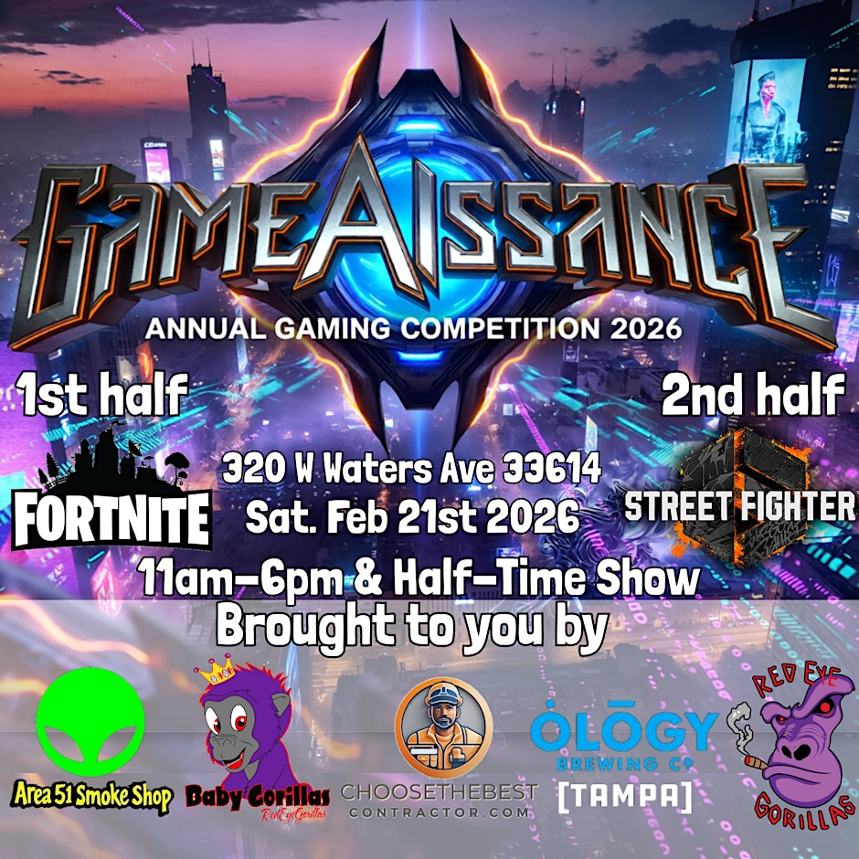 The Gameaissance Annual Gaming Competition 2026, organized by Gameaissance, is set to bring together gamers and esports fans for a full day of competitive play and community connection in Tampa. The event will take place on February 21, 2026, from 11:00 AM to 6:00 PM (EST) at 320 W Waters Ave, Tampa, Florida. Attendees can expect an exciting lineup of gaming competitions and a lively atmosphere celebrating gaming culture. 🎟 Event Registration: https://www.eventbrite.com/e/gameaissance-annual-gaming-competition-2026-tickets-1980474702147?aff=ebdssbdestsearch 📱 Social Media: Instagram: https://www.instagram.com/p/DTsyGXgDlWm/ #Tampa #TampaBay #StPete #Clearwater #ThingsToDo #LocalEvents #Networking #TampaBayConnects #TampaNetworking #WomenInBusiness #TampaEntrepreneurs #Startups #TampaEats #TampaNightlife #DowntownTampa #TampaEvents #TampaSocials #tampaMagazine #TampaBayMagazine TampaBusinessClub.com Tampabayconnects.com WomenImpactNetwork.com TampaBayLatinChamber.com InGateConsulting.com 🎟 Event Registration: https://www.eventbrite.com/e/gameaissance-annual-gaming-competition-2026-tickets-1980474702147?aff=ebdssbdestsearch Tampa Bay Connects is a community discovery and media platform. We do not organize, host, manage, or operate the events featured on this site. All events, trademarks, logos, photographs, and promotional materials are the property of their respective owners and are displayed for informational and promotional purposes only. Our content is shared to help connect the community with local experiences and is sourced from public event listings, organizers, or official promotional channels. Full credit is given to the original event organizers, and direct links to official event pages are provided whenever available. Inclusion on TampaBayConnects.com does not imply sponsorship, partnership, or endorsement by Tampa Bay Connects, unless explicitly stated. tampabayconnects