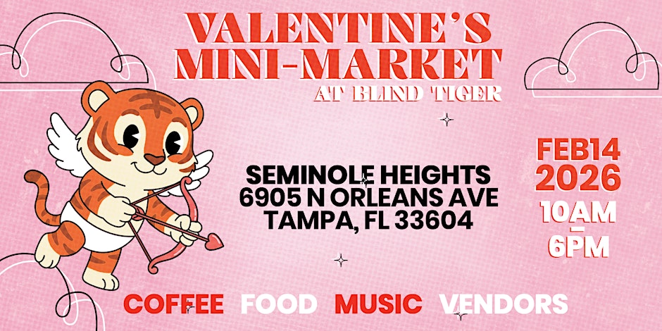 Valentine’s Market 2026 is set to bring festive vibes to Seminole Heights with a full day of shopping, local makers, and Valentine’s-inspired finds—perfect for celebrating love and community in Tampa Bay. Event Details Event: Valentine’s Market 2026 Organizer: Creators Collective Market Date: February 14, 2026 Time: 10:00 AM – 6:00 PM (EST) Location: Blind Tiger Coffee Roasters – Seminole Heights Hosted at Blind Tiger Coffee Roasters in Seminole Heights, this Valentine’s Market will feature local vendors, handmade goods, and a lively atmosphere—making it a great stop for unique gifts and supporting small businesses. 🎟️ Registration: More details and tickets are available via Eventbrite: https://www.eventbrite.com/e/valentines-market-2026-tickets-1982061612639?aff=ebdssbdestsearch 📲 Social Media & Links: Facebook (Blind Tiger Coffee Roasters): https://www.facebook.com/blindtigercoffeeroasters/ Instagram (Creators Collective Market): https://www.instagram.com/creatorscollectivemarket/p/DUgWT8yiRMv/ Instagram (Blind Tiger Coffee Roasters): https://www.instagram.com/blindtigercoffeeroasters/?hl=en Website: https://blindtigercoffeeroasters.com/ #Tampa #TampaBay #StPete #Clearwater #ThingsToDo #LocalEvents #Networking #TampaBayConnects #TampaNetworking #WomenInBusiness #TampaEntrepreneurs #Startups #TampaEats #TampaNightlife #DowntownTampa #TampaEvents #TampaSocials #tampaMagazine #TampaBayMagazine TampaBusinessClub.com Tampabayconnects.com WomenImpactNetwork.com TampaBayLatinChamber.com InGateConsulting.com 🎟️ Registration: More details and tickets are available via Eventbrite: https://www.eventbrite.com/e/valentines-market-2026-tickets-1982061612639?aff=ebdssbdestsearch Tampa Bay Connects is a community discovery and media platform. We do not organize, host, manage, or operate the events featured on this site. All events, trademarks, logos, photographs, and promotional materials are the property of their respective owners and are displayed for informational and promotional purposes only. Our content is shared to help connect the community with local experiences and is sourced from public event listings, organizers, or official promotional channels. Full credit is given to the original event organizers, and direct links to official event pages are provided whenever available. Inclusion on TampaBayConnects.com does not imply sponsorship, partnership, or endorsement by Tampa Bay Connects, unless explicitly stated. tampabayconnects