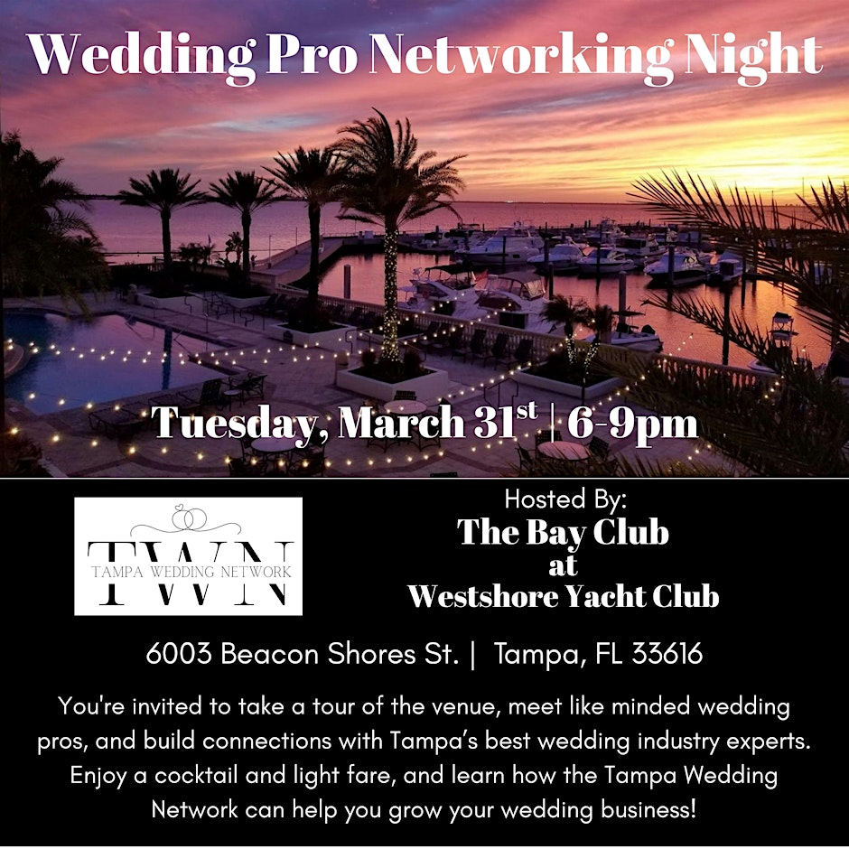 Tampa Wedding Network: the Wedding Pro Networking Night, happening on March 31 from 6:00 PM to 9:00 PM EDT at The Bay Club at the Westshore Yacht Club in Tampa, Florida. This gathering is designed for wedding professionals to connect, collaborate, and grow their businesses within the local events community. Attendees can expect an evening of meaningful networking with fellow planners, photographers, venues, florists, and other wedding industry experts. It’s a great opportunity to build relationships, exchange referrals, and stay connected with Tampa Bay’s vibrant wedding market. Event Details: Organizer: Tampa Wedding Network Date & Time: March 31, 6:00 PM – 9:00 PM EDT Location: The Bay Club at the Westshore Yacht Club, Tampa, FL Registration: https://www.eventbrite.com/e/wedding-pro-networking-night-tickets-1983420396799?aff=ebdssbdestsearch Follow the Organizer: Instagram: https://www.instagram.com/tampa_wedding_network/ Facebook: https://www.facebook.com/TampaWeddingNetworkFL/ Website: https://www.tampaweddingnetwork.org/ #Tampa #TampaBay #StPete #Clearwater #ThingsToDo #LocalEvents #Networking #TampaBayConnects #TampaNetworking #WomenInBusiness #TampaEntrepreneurs #Startups #TampaEats #TampaNightlife #DowntownTampa #TampaEvents #TampaSocials #tampaMagazine #TampaBayMagazine TampaBusinessClub.com Tampabayconnects.com WomenImpactNetwork.com TampaBayLatinChamber.com InGateConsulting.com Registration: https://www.eventbrite.com/e/wedding-pro-networking-night-tickets-1983420396799?aff=ebdssbdestsearch Tampa Bay Connects is a community discovery and media platform. We do not organize, host, manage, or operate the events featured on this site. All events, trademarks, logos, photographs, and promotional materials are the property of their respective owners and are displayed for informational and promotional purposes only. Our content is shared to help connect the community with local experiences and is sourced from public event listings, organizers, or official promotional channels. Full credit is given to the original event organizers, and direct links to official event pages are provided whenever available. Inclusion on TampaBayConnects.com does not imply sponsorship, partnership, or endorsement by Tampa Bay Connects, unless explicitly stated. tampabayconnects
