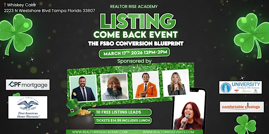Listing Comeback: The FSBO Conversion Blueprint — Tampa Event Spotlight Real estate professionals in the Tampa Bay area have an opportunity to sharpen their listing strategies at the upcoming “Listing Comeback: The FSBO Conversion Blueprint” event. Organized by Realtor Rise Academy, this informative session is designed to help agents learn proven techniques for converting For Sale By Owner (FSBO) properties into successful listings. The event will take place on Tuesday, March 17, from 12:00 PM to 2:00 PM at 2223 N Westshore Blvd, Tampa, FL. Attendees can expect practical insights, networking opportunities with fellow real estate professionals, and actionable strategies aimed at growing their listing pipeline. Those interested in attending can register through Eventbrite using the following link: https://www.eventbrite.com/e/listing-comeback-the-fsbo-conversion-blueprint-tickets-1982445157833?aff=ebdssbdestsearch For more information about the organizers, visit the Realtor Rise Academy website at: https://realtorriseacademy.com/ Follow Realtor Rise Academy on social media for updates and event highlights: Instagram: https://www.instagram.com/p/DVb9X4rlMPk/ Facebook: https://www.facebook.com/realtorriseacademy/ #Tampa #TampaBay #StPete #Clearwater #ThingsToDo #LocalEvents #Networking #TampaBayConnects #TampaNetworking #WomenInBusiness #TampaEntrepreneurs #Startups #TampaEats #TampaNightlife #DowntownTampa #TampaEvents #TampaSocials #tampaMagazine #TampaBayMagazine TampaBusinessClub.com Tampabayconnects.com WomenImpactNetwork.com TampaBayLatinChamber.com InGateConsulting.com 🔗 https://www.eventbrite.com/e/listing-comeback-the-fsbo-conversion-blueprint-tickets-1982445157833?aff=ebdssbdestsearch Tampa Bay Connects is a community discovery and media platform. We do not organize, host, manage, or operate the events featured on this site. All events, trademarks, logos, photographs, and promotional materials are the property of their respective owners and are displayed for informational and promotional purposes only. Our content is shared to help connect the community with local experiences and is sourced from public event listings, organizers, or official promotional channels. Full credit is given to the original event organizers, and direct links to official event pages are provided whenever available. Inclusion on TampaBayConnects.com does not imply sponsorship, partnership, or endorsement by Tampa Bay Connects, unless explicitly stated. tampabayconnects